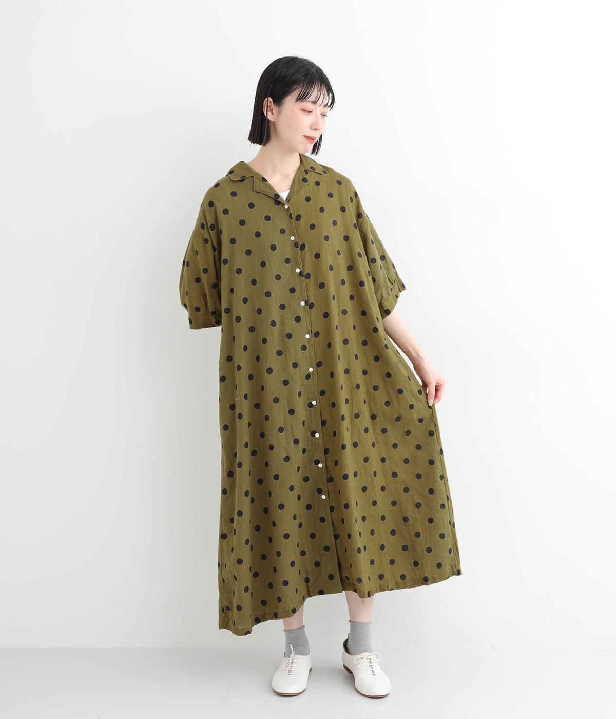 ポリエステルツイルドットプリント長袖ワンピースカーキ