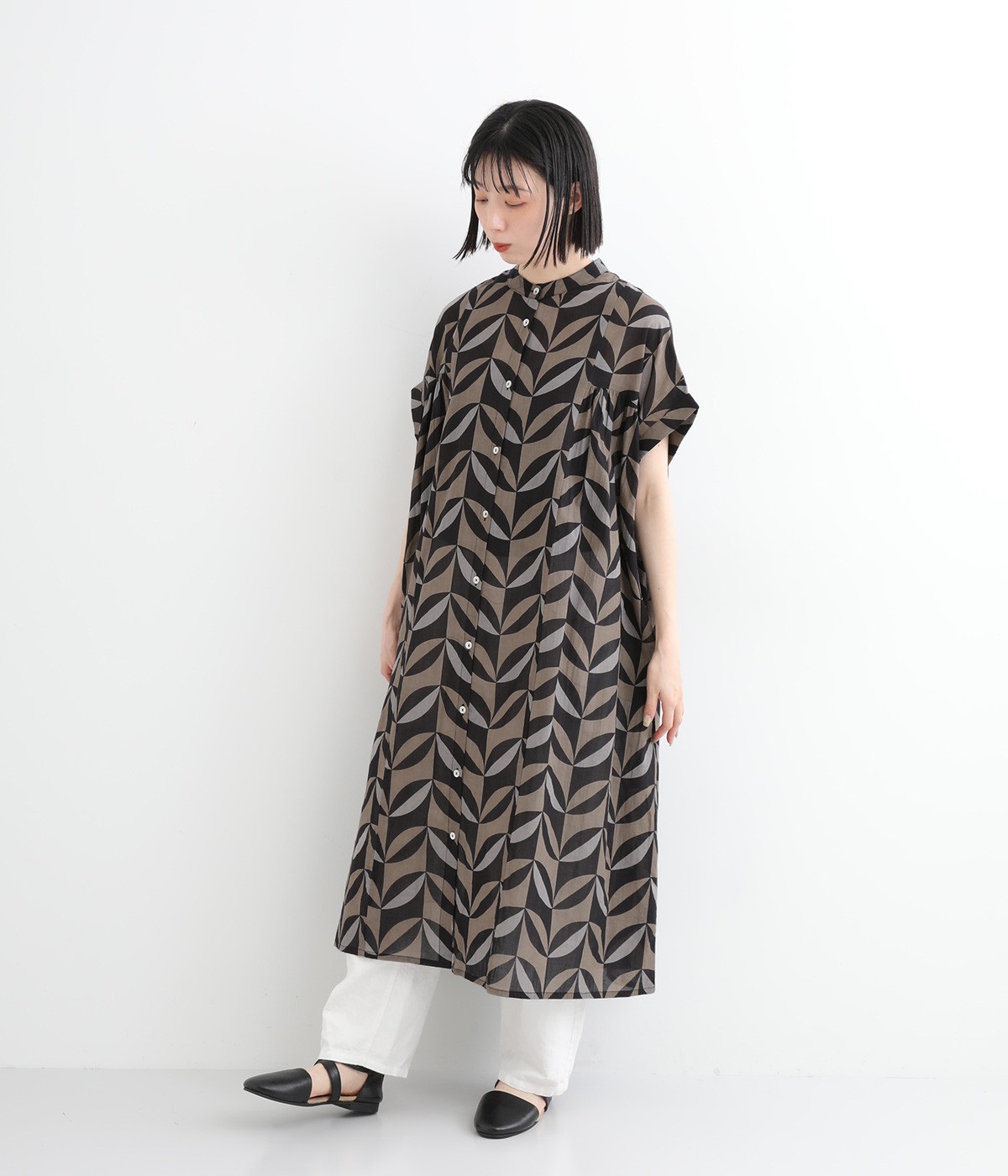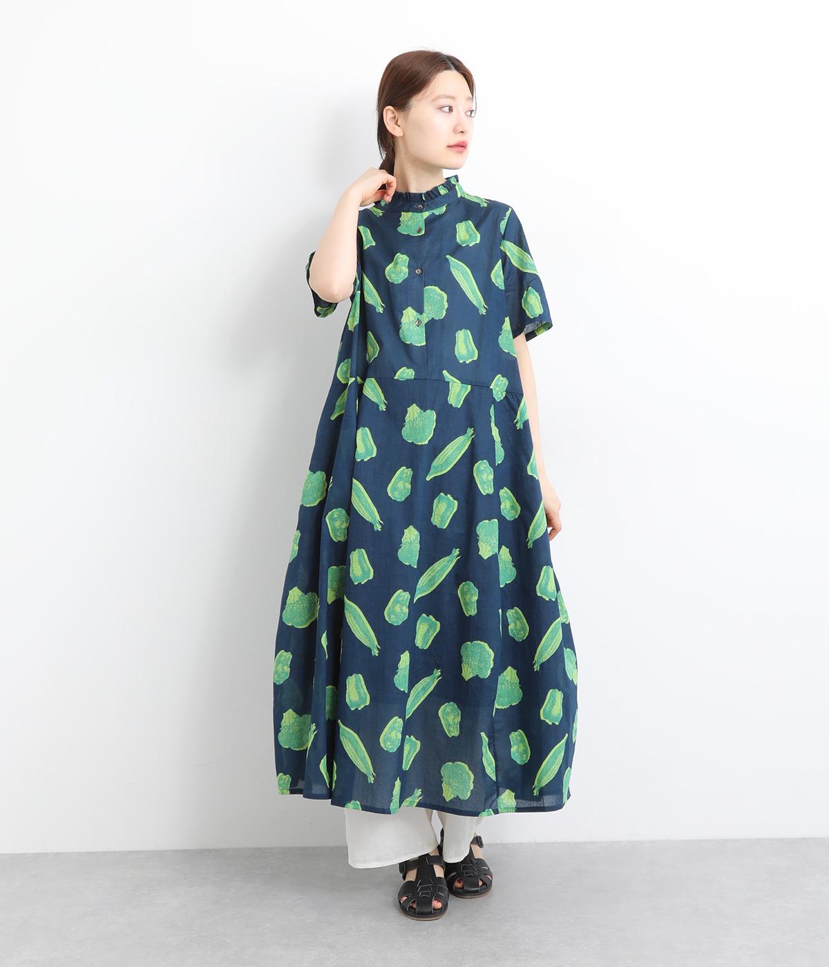 フローラルブロックプリントコットン前開ワンピースグリーン