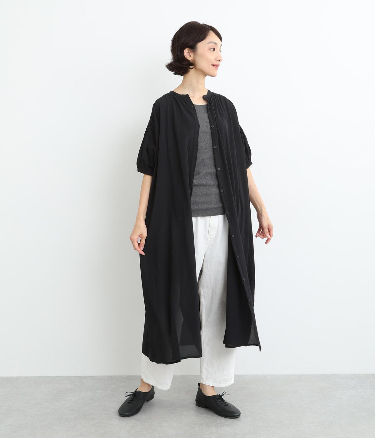 ライトコットンリネンデニム前開き切替ギャザーワンピースブラック