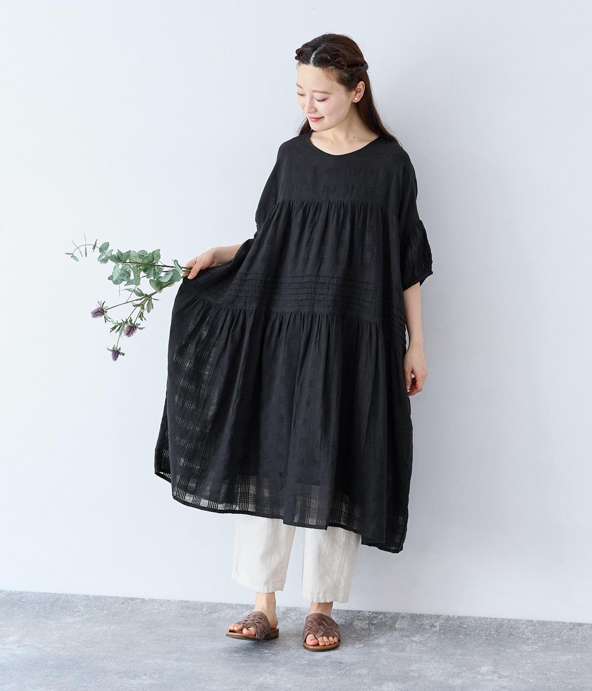 14番手リネンアシンメトリーピンタックギャザーワンピースブラック×ブラック