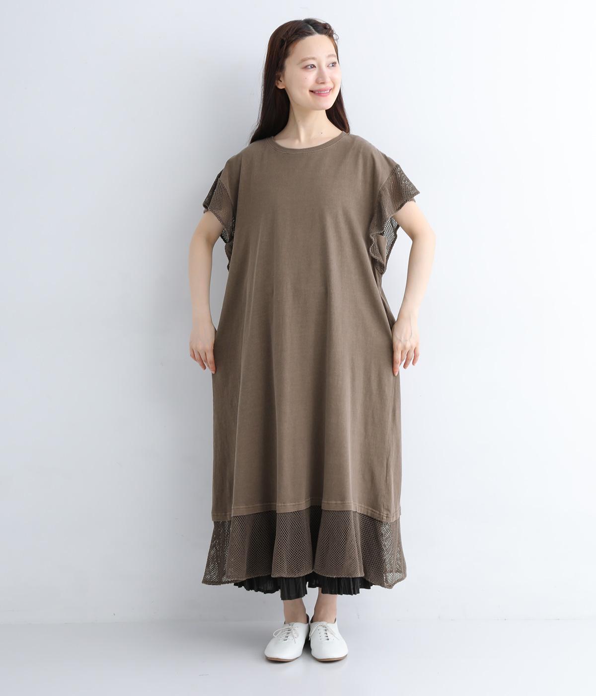 ウールコットンワッシャー袖リブニットチュニックワンピースモカ