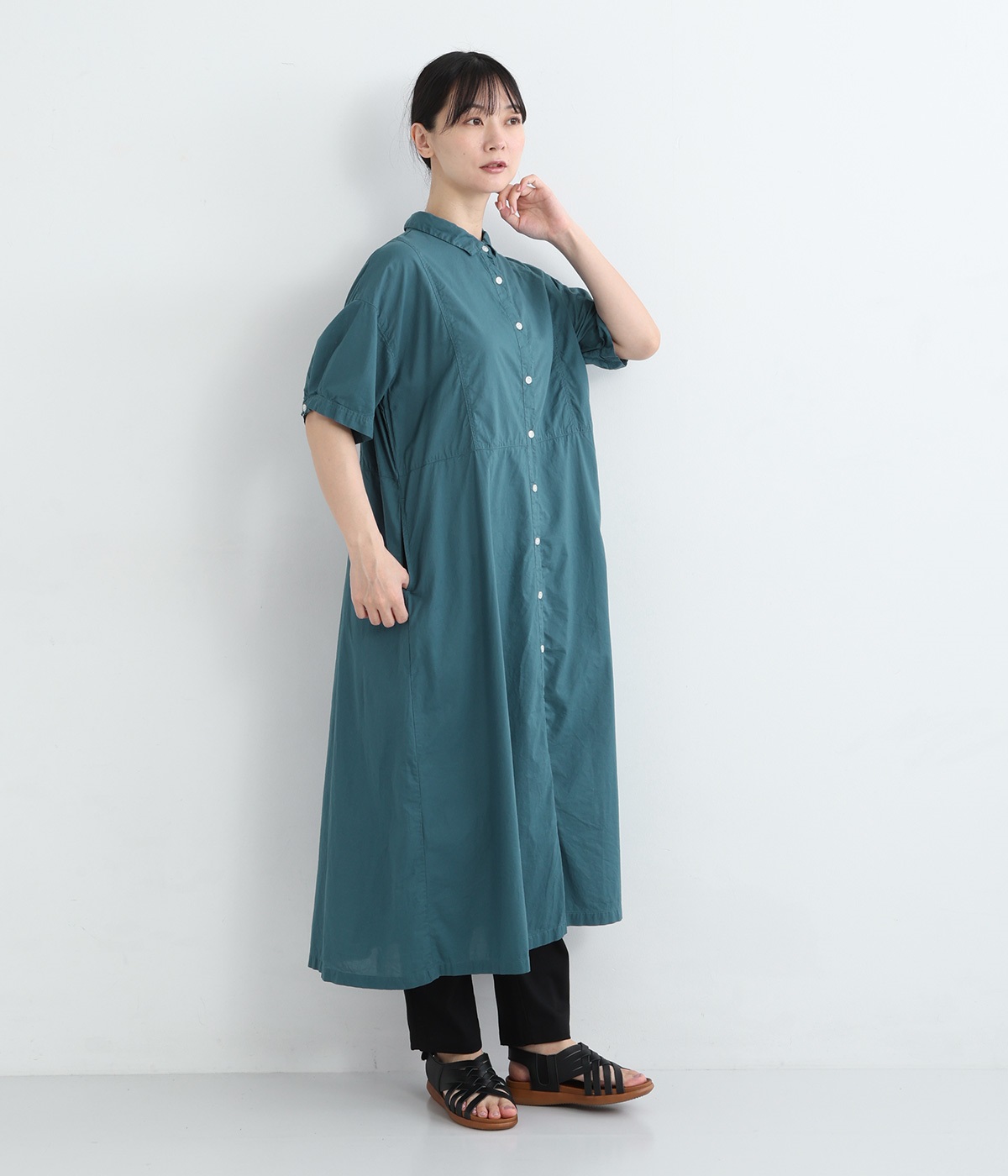 Easy Care梳毛天竺ポロ襟ギャザーワンピースグリーン