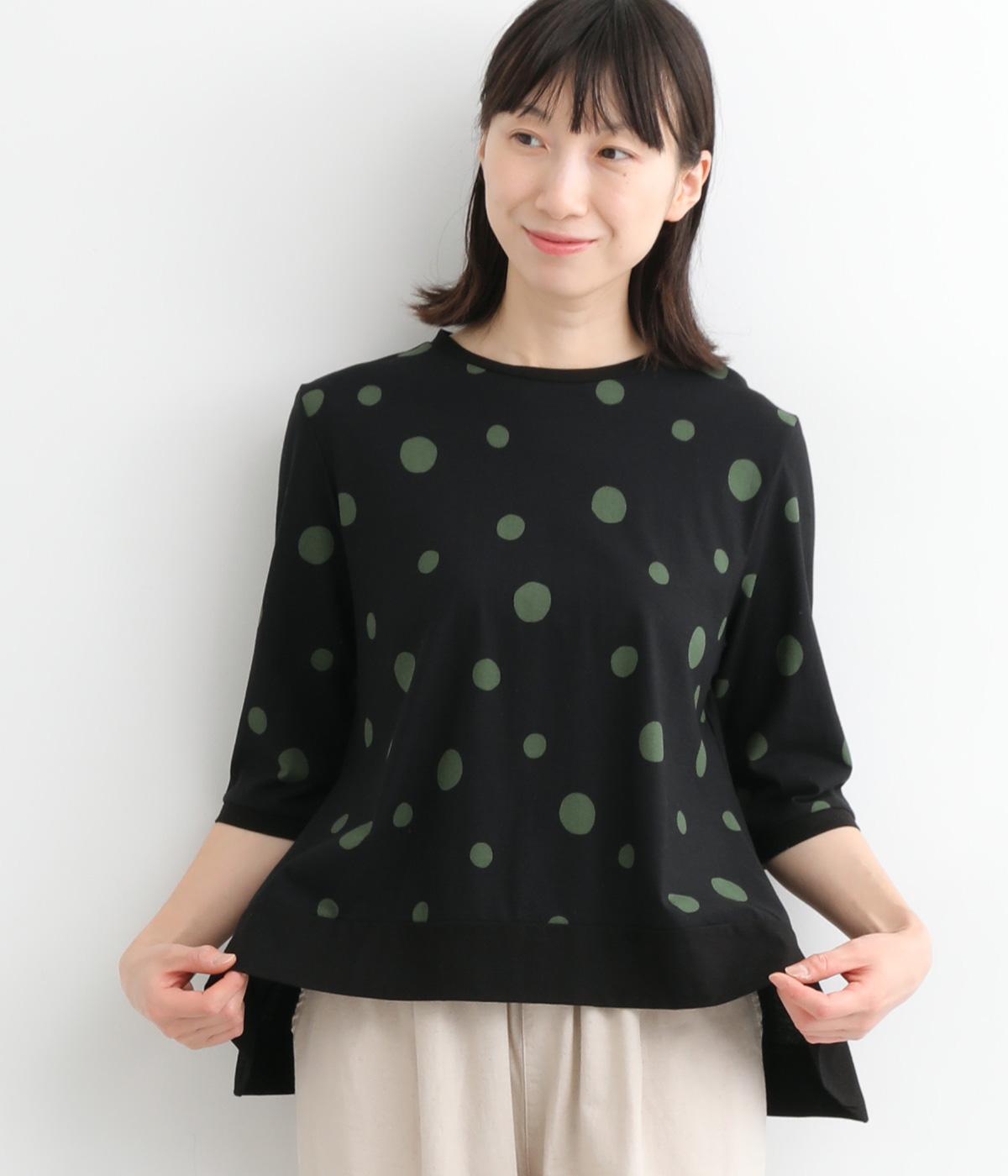 ポリエステルツイルドットプリント前後2way長袖チュニックブラウスカーキ