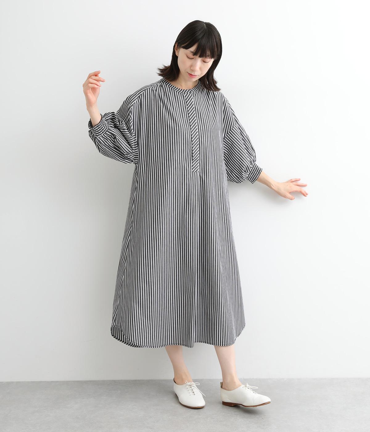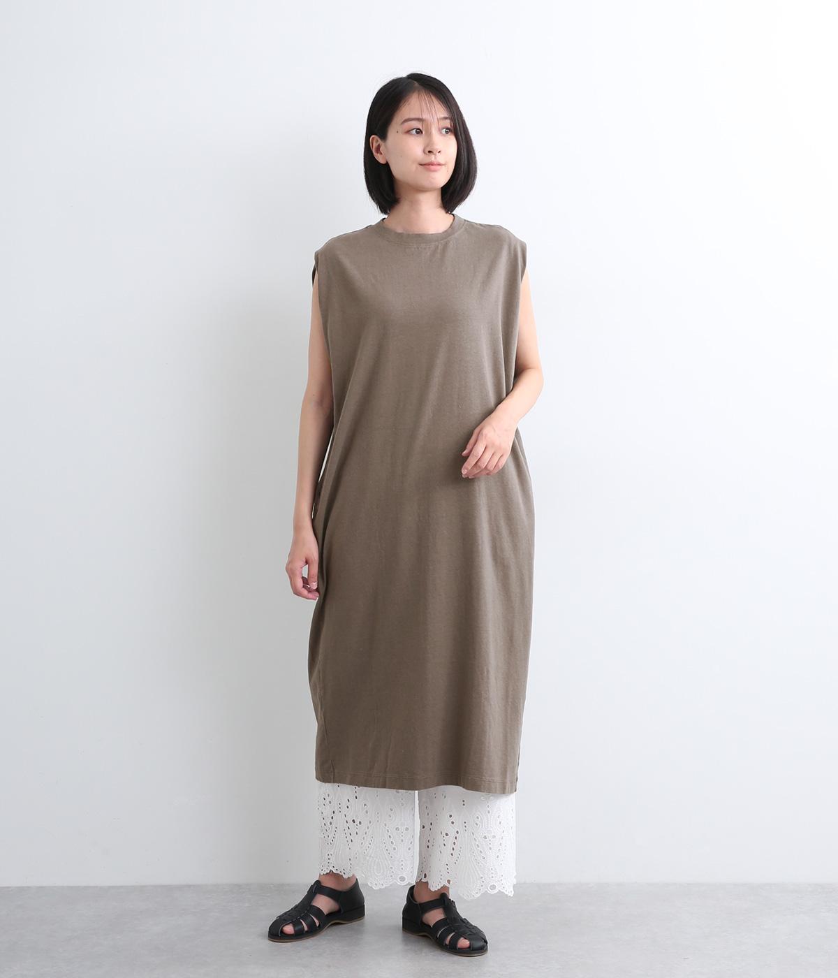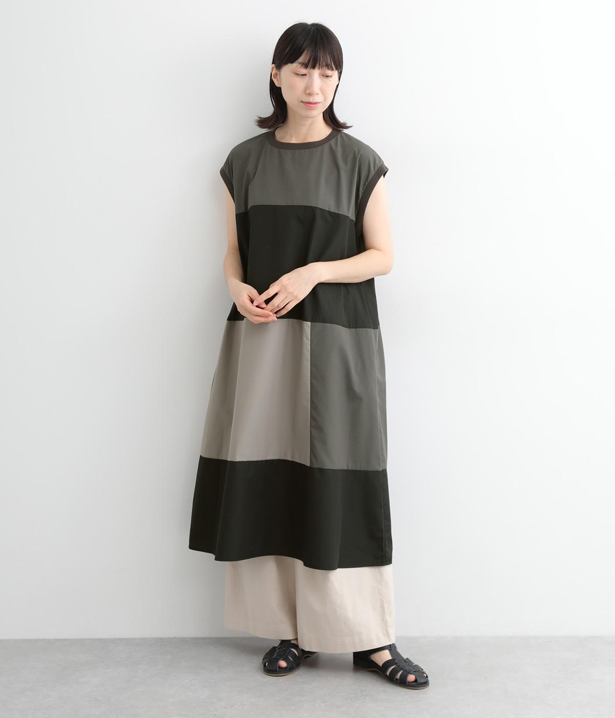 コットン平織日本製品染長袖ワンピースカーキベージュ