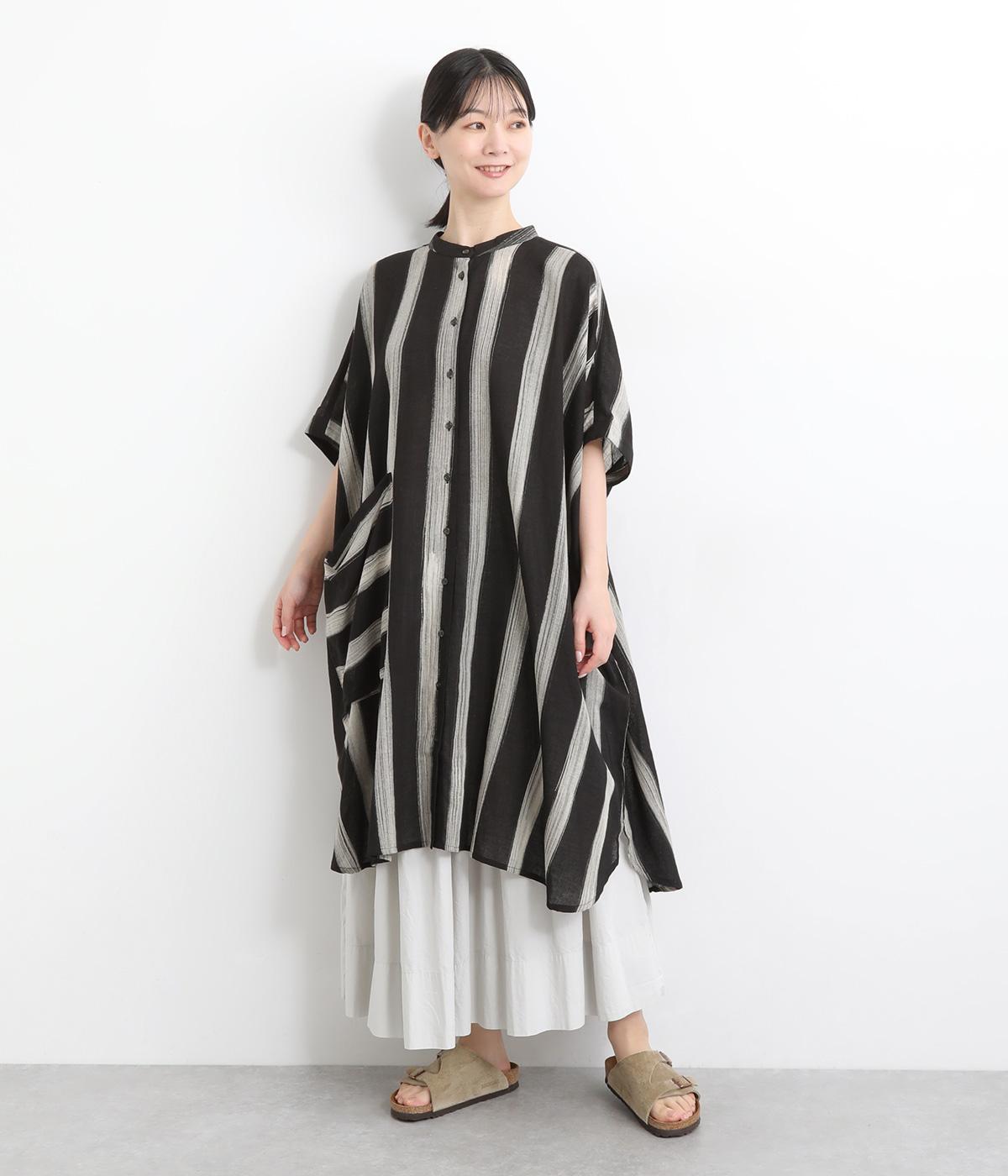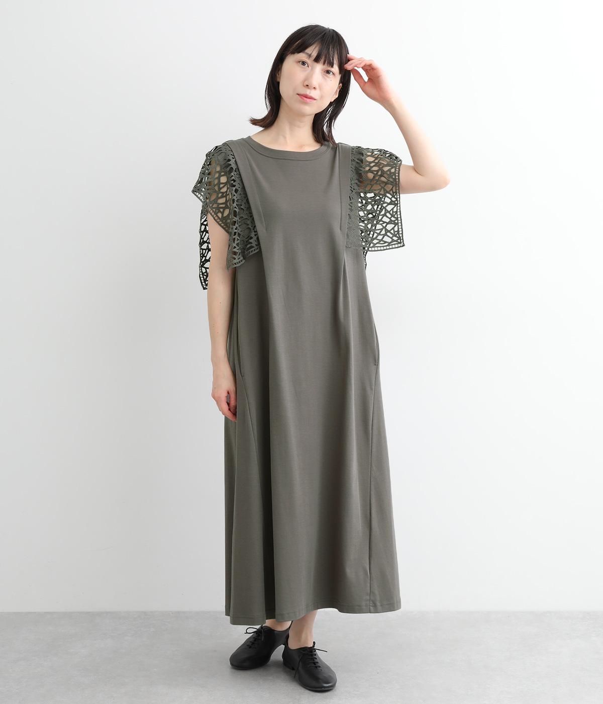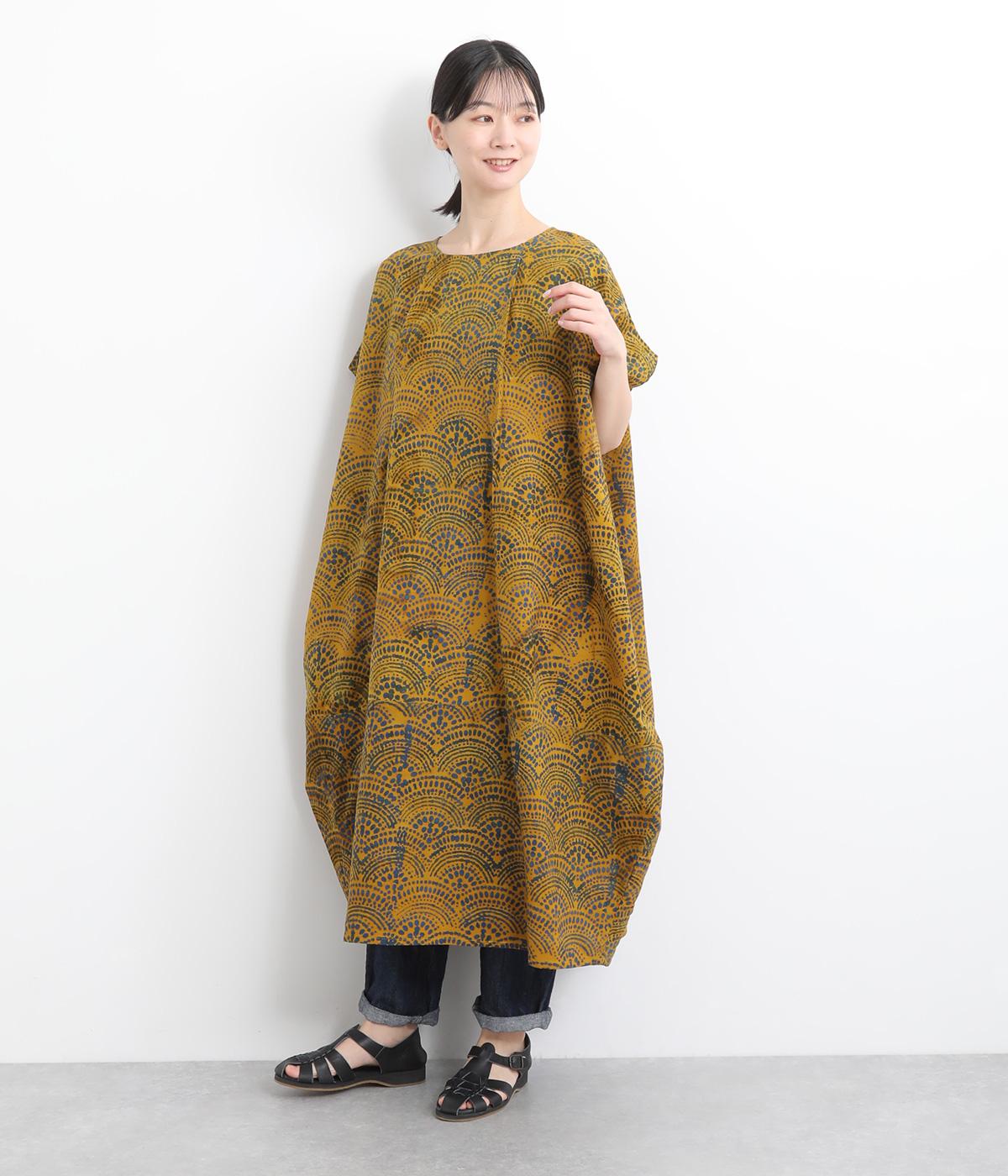 コットン平織日本製品染長袖ワンピースカーキベージュ