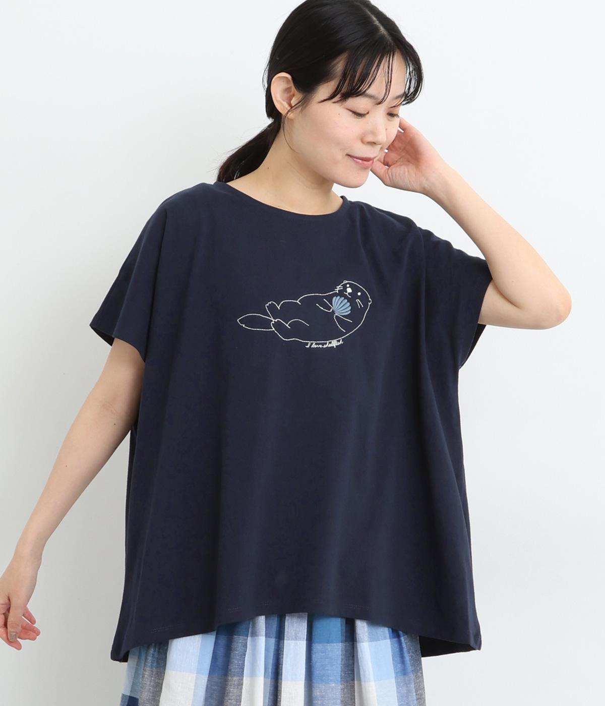 コットンリネンドビーシャンブレー起毛首元フリル長袖ブラウスダークネイビー