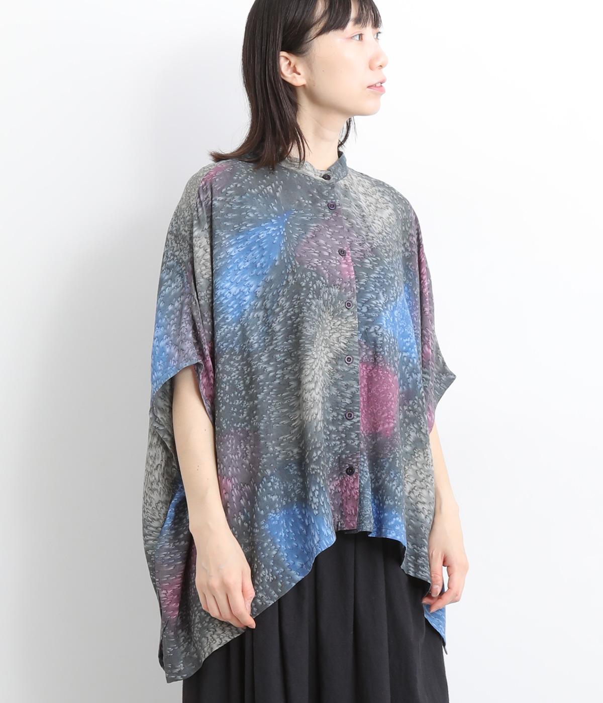 ポリエステルツイルドットプリント前後2way長袖ブラウスグレー