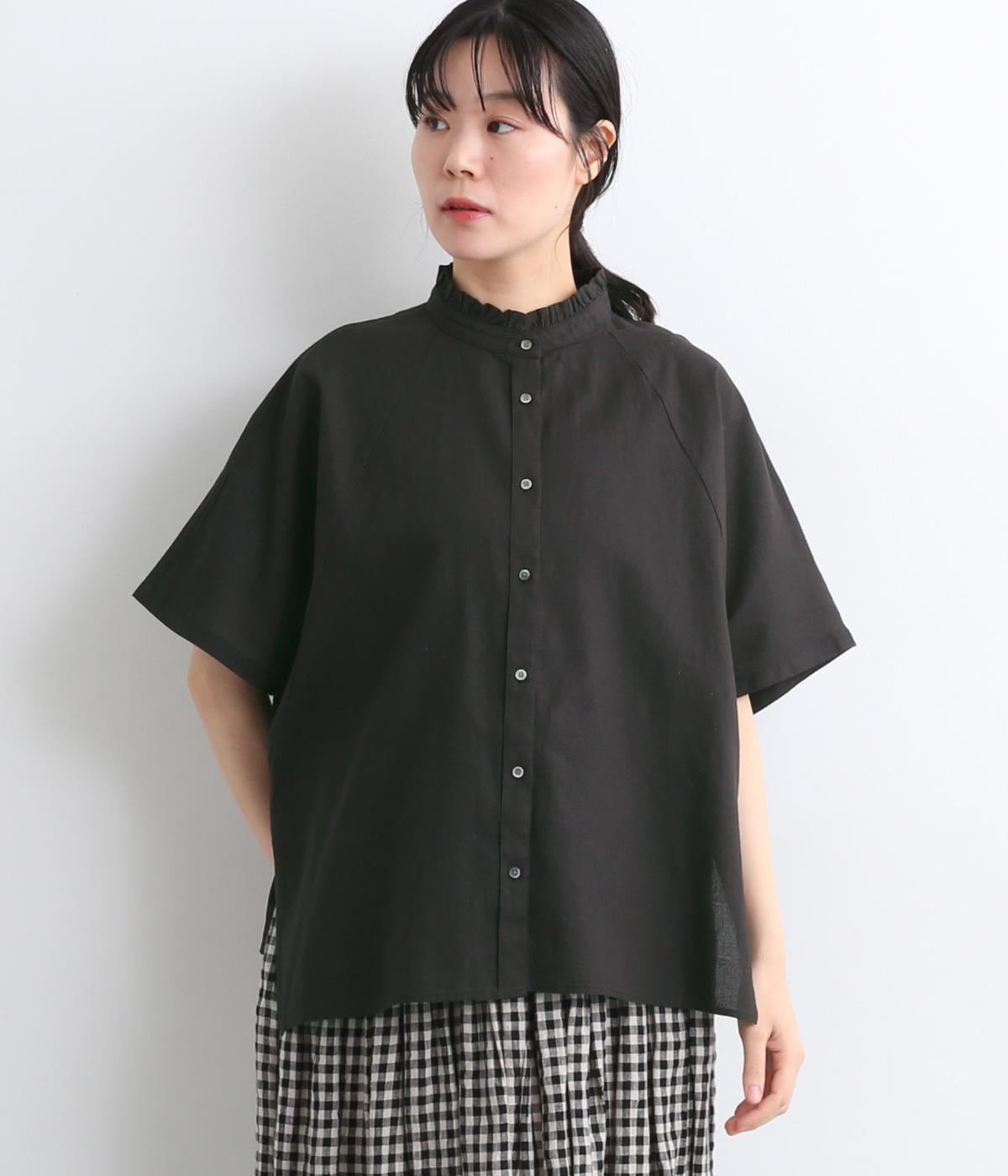 コットンリネンドビーシャンブレー起毛首元フリル長袖ブラウスキミドリ