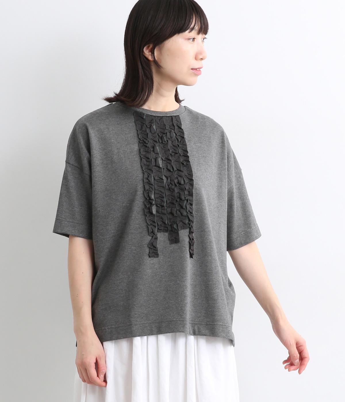 コットンリネンドビーシャンブレー起毛首元フリル長袖ブラウスグレージュ