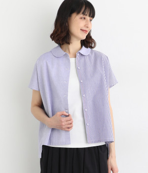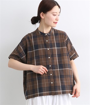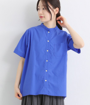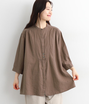 リネンコットンデニムバンド襟シャツブラウス