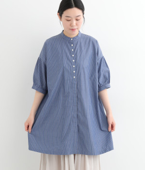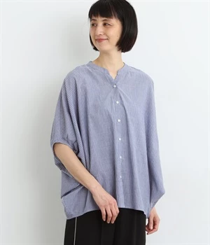 コットンストライプ バンドカラーシャツ