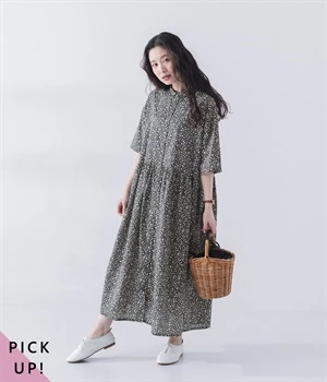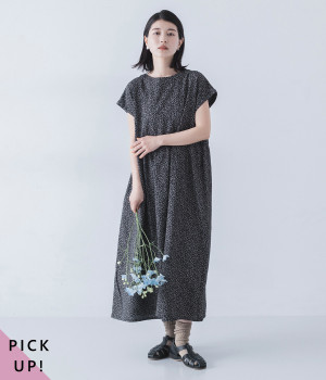 コットンコーデュロイ小花プリントウエストギャザーワンピース