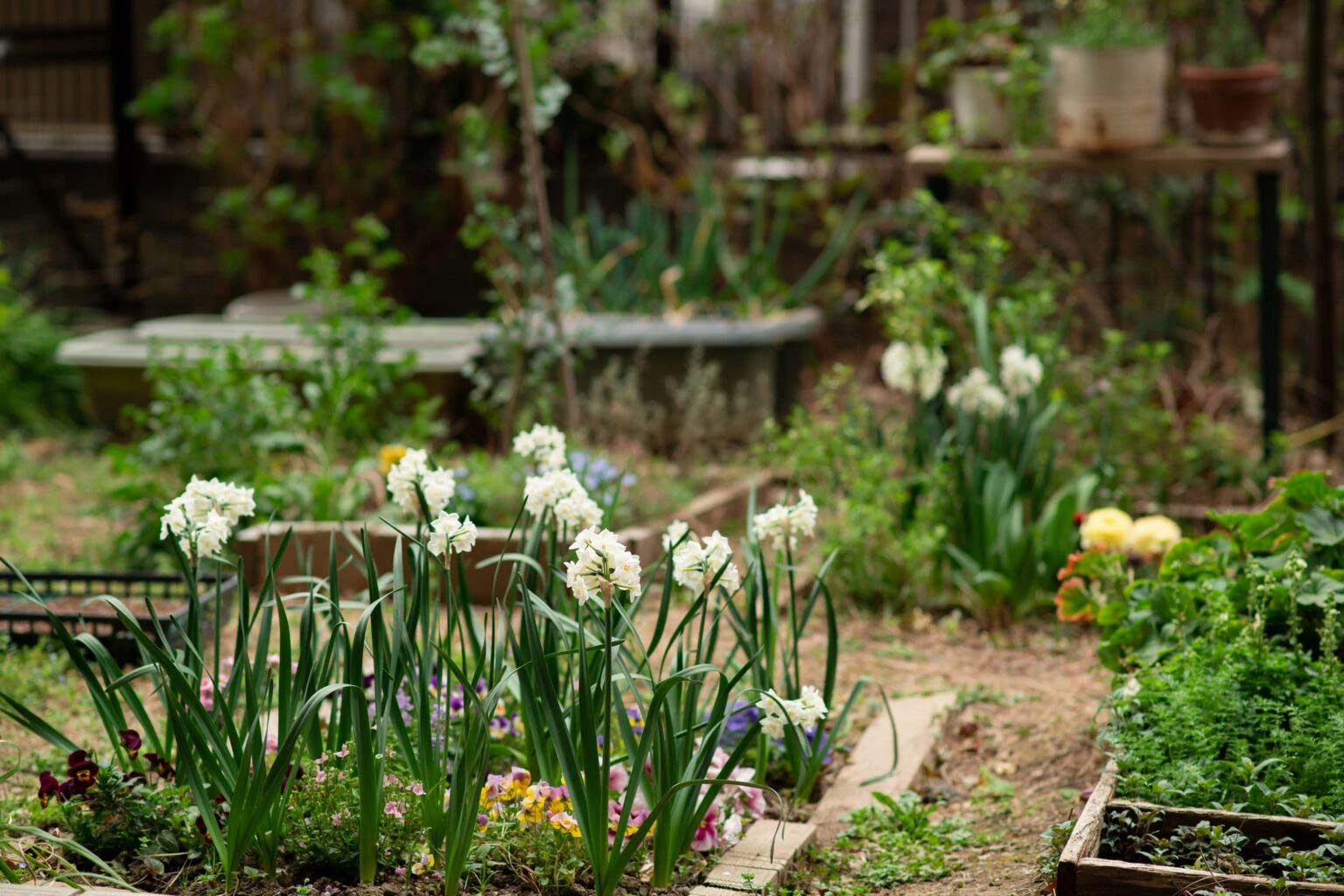 若草色のクリスマスローズ、甘い香りのスイセン、バスケットに寄せ植えた愛らしいビオラやパンジーたち。春の花々で彩られた庭は、ここから初夏に向かってたくさんのハーブが育ち、梅雨には生垣のカシワバアジサイが青紫の色をつけ、夏にはフウセンカズラがつるを伸ばすのだそうです。