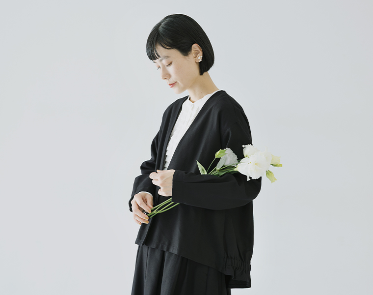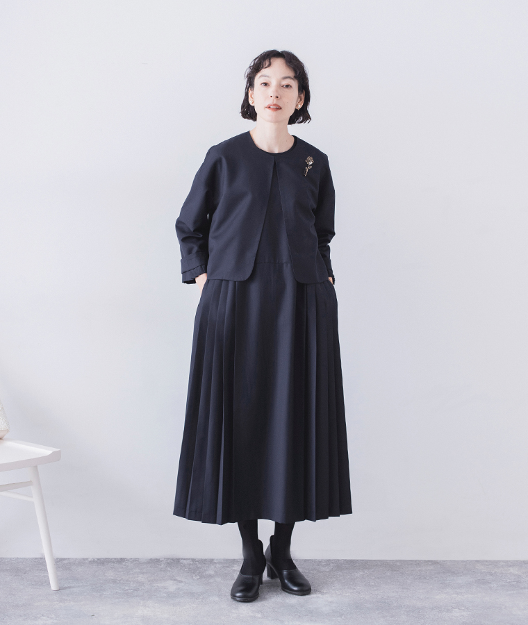 袖口のアレンジが楽しめるジャケットと、上品なプリーツが引き立つワンピースのアンサンブルは、毎年大好評いただくナチュラン別注アイテム。体型に合わせたM・Lの2サイズ展開で、フォーマルな場面にほどよい華やかさを添えてくれる一着です。