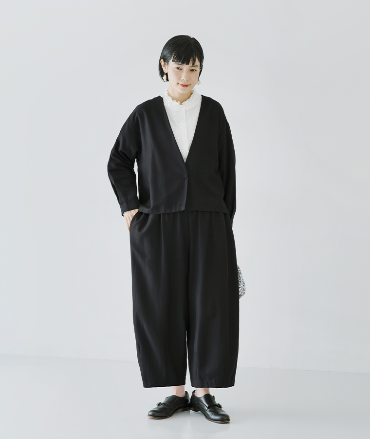 ジャケットはノーカラーのネックラインにホックをひとつあしらい、顔まわりもすっきり。ホックからV字に開くラインが、ほどよい抜け感をプラス。