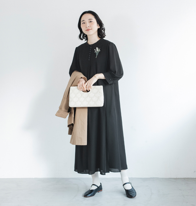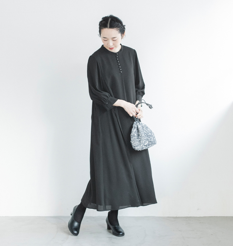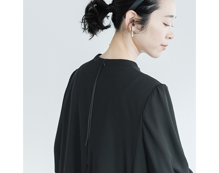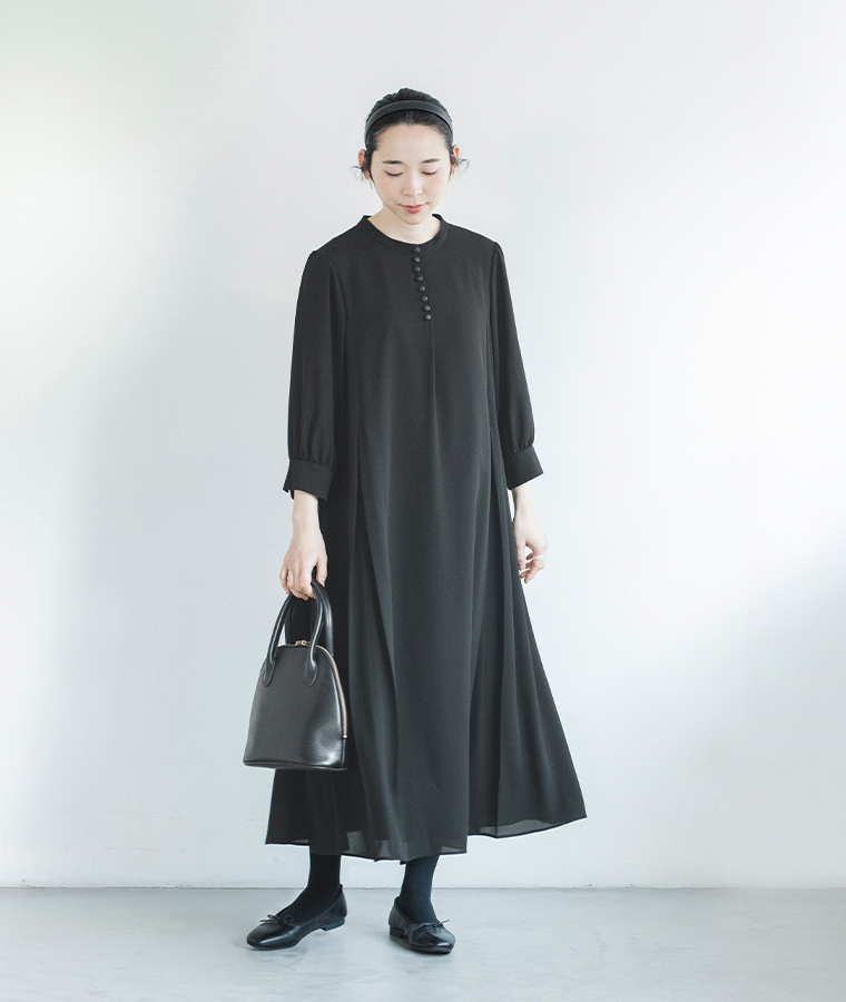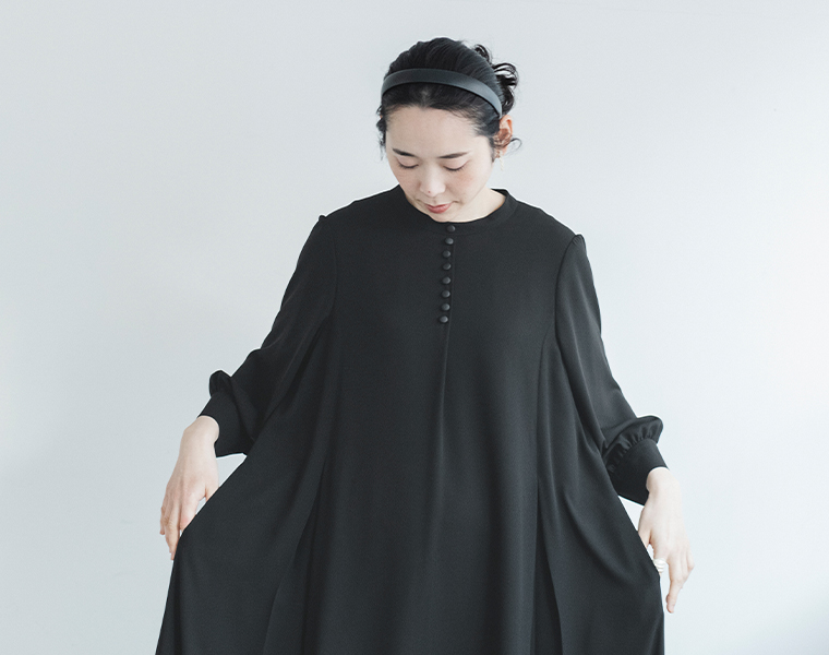 やさしくラウンドしたネックラインが、顔まわりに穏やかな雰囲気を与えるワンピース。飾りすぎない美しさが、着る人の魅力をそっと引き出します。