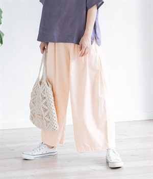 サイドに深いタックを入れたワイドパンツ。ラウンドしたコクーンシルエットは、動きやすさと女性らしいやわらかさを両立します。