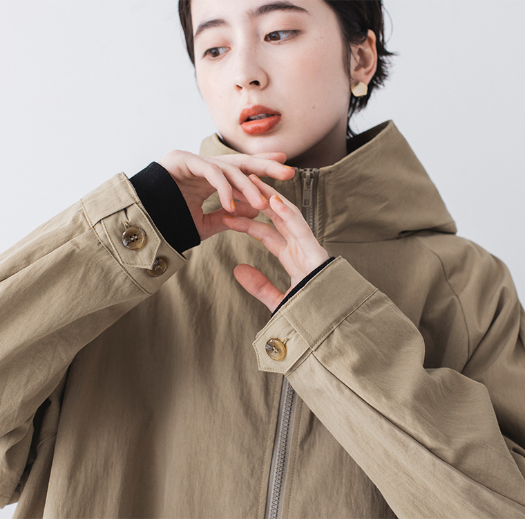 <グレイベージュ>はニュアンスを添えた春らしい明るいカラー。ジップを閉めれば、襟元がすっと立ち上がり、スタイリッシュな雰囲気に。