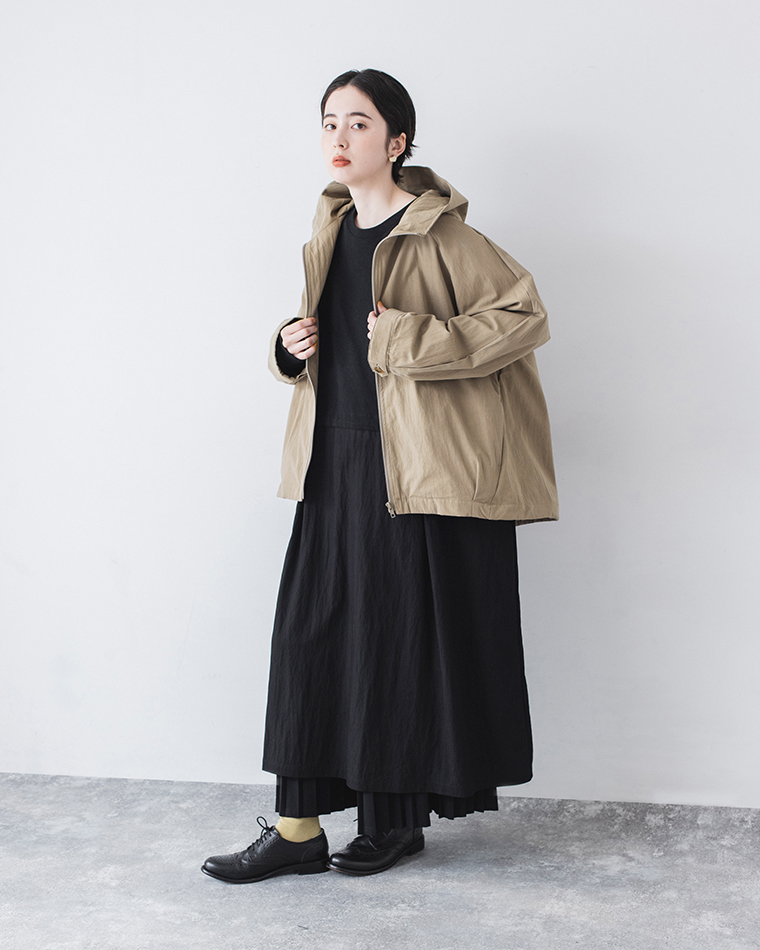 フードブルゾンを主役に、ブラックワンピースで縦のラインをすっきりと仕上げたスタイル。足元にはイエローのソックスを合わせて、ほどよい抜け感と遊び心を添えました。