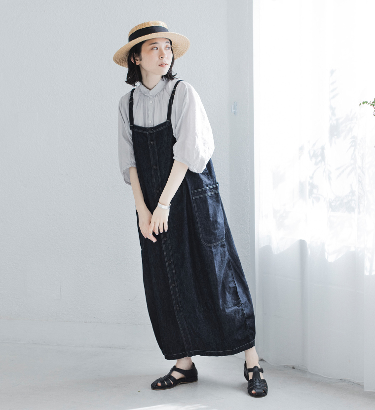 軽やかな6.5ozデニムで仕立てた、ワークテイストのサロペットスカート。