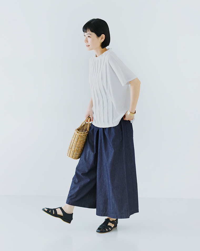 オフホワイトにデニムのワイドパンツを合わせた爽やかな春の装い。カジュアルなTシャツの着こなしが難しい大人にこそおすすめしたい、しなやかで女性らしいカラーです。