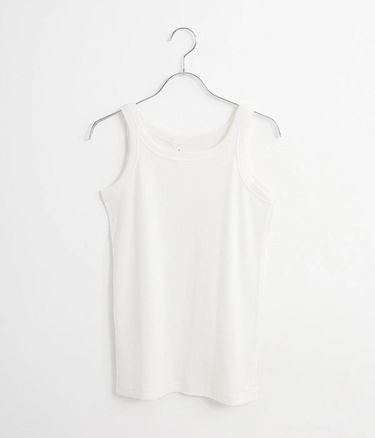 最初の写真ではシャツと合わせて白のタンクトップを選びましたが、このようにボトムのグレーと合わせても、上下につながりが生まれて、まとまりのある印象になります」