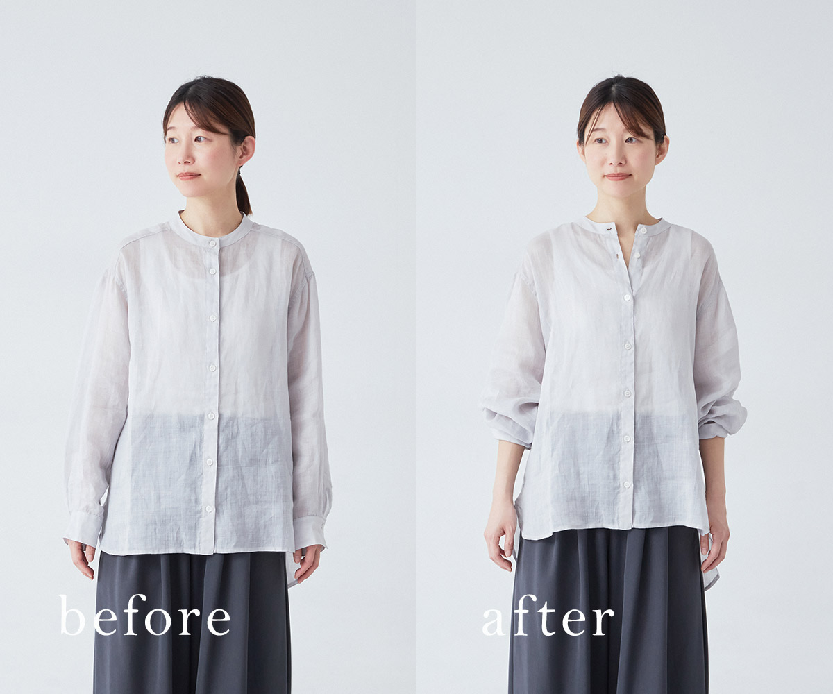 ーープレーンなデザインのリネンのシャツ。ただ着るだけだとなんとなく物足りない気がします。おしゃれに見せるコツはありますか?