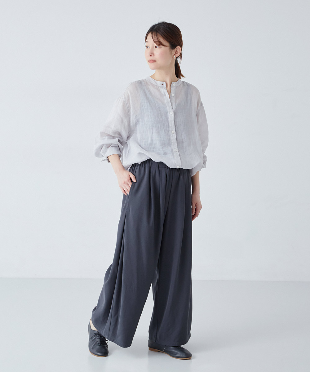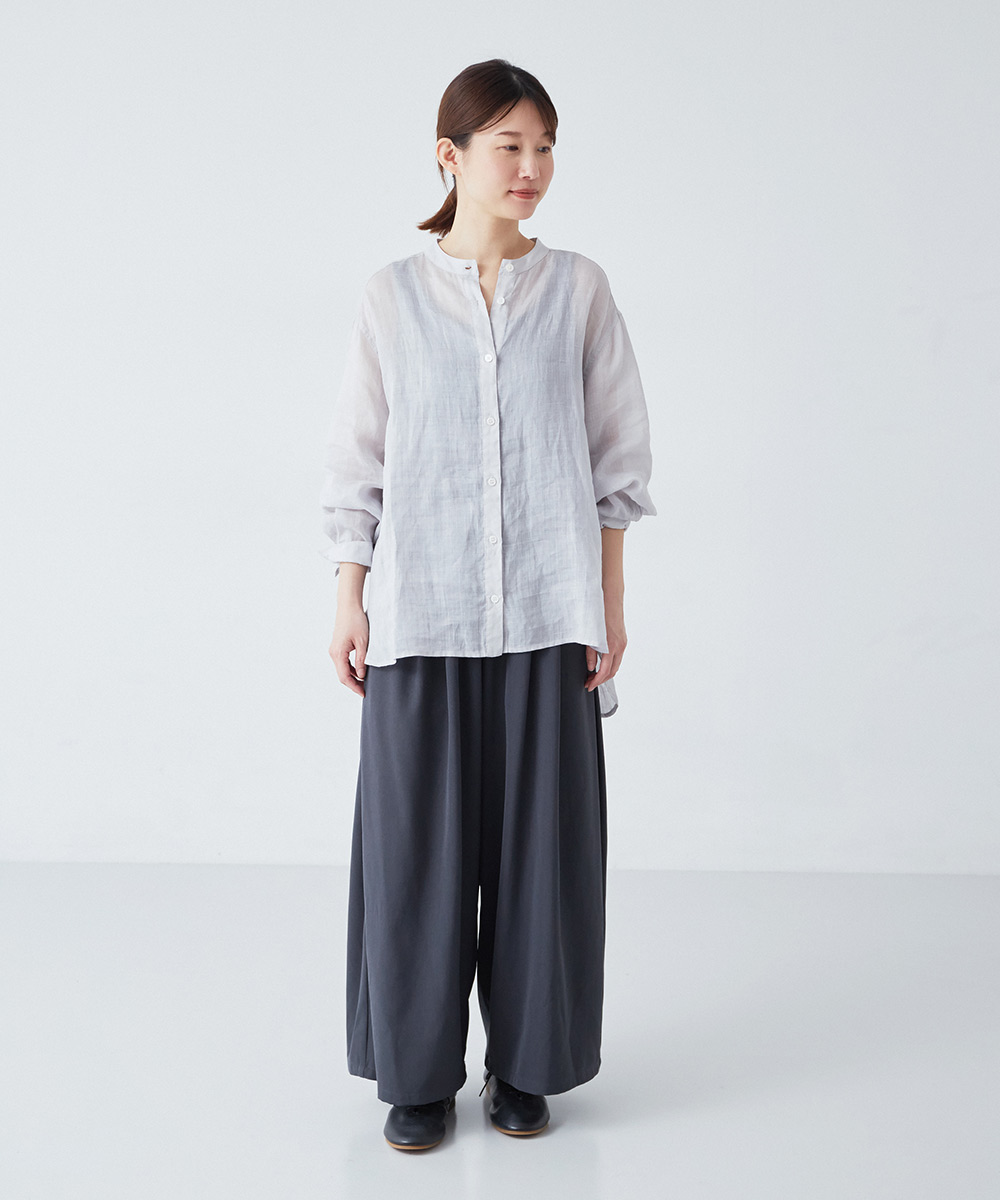 ▲シアーリネンバンドカラーブラウス ¥8,910/&yarn、ストライプシャツは参考商品