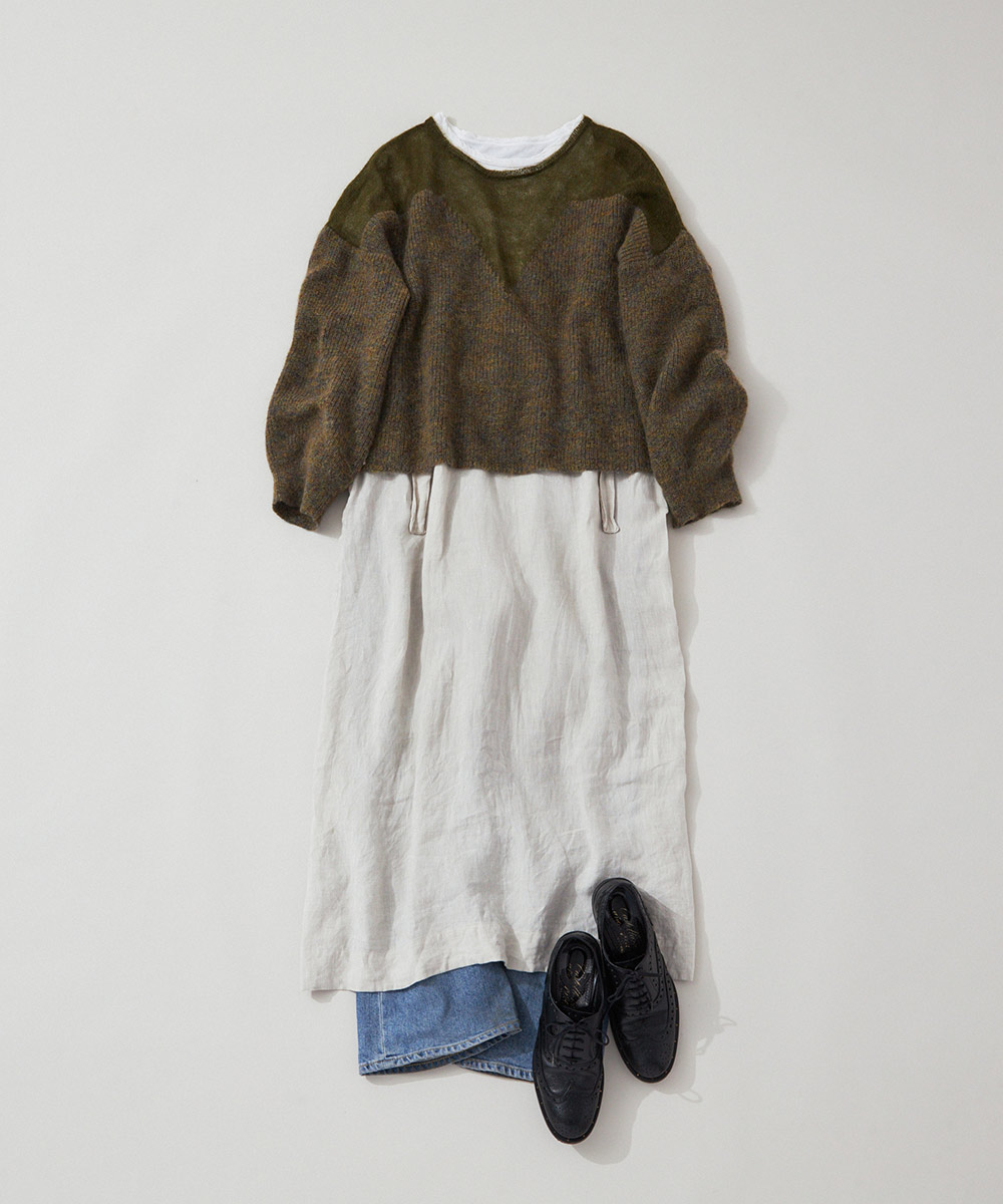 ボリュームのあるニットの存在感がリネンの夏のイメージを払拭し、冬らしいぬくもりを感じる着こなしに見せてくれます」