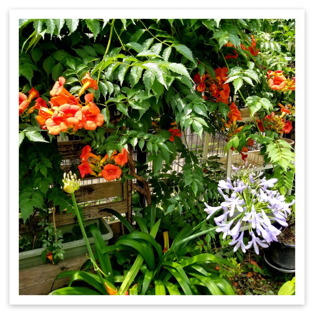 花火のようにアガパンサスが咲いて、プランターで育てているノウゼンカズラも満開になった。