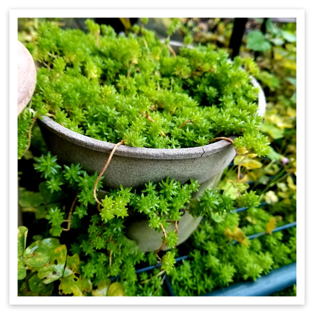 鉢植えのひび割れた隙間から勢いよく生えてくるセダムの緑。