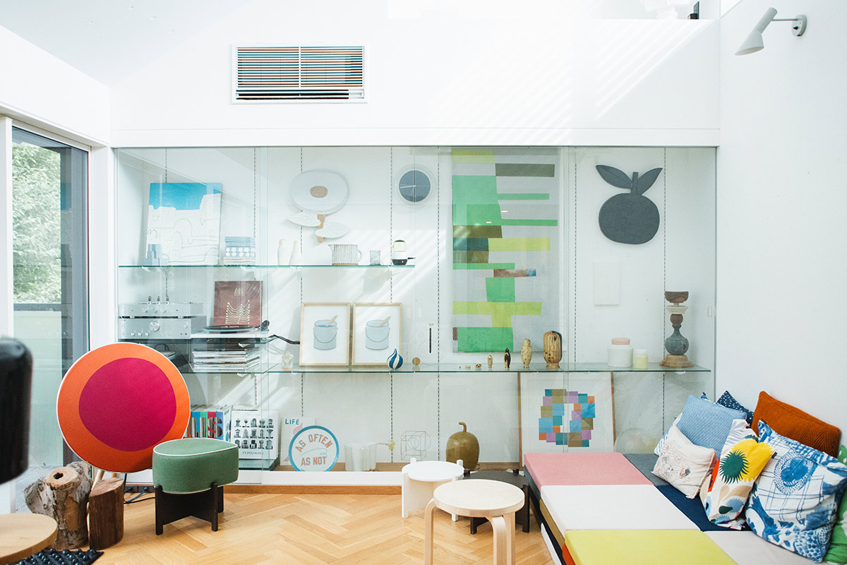 リビングに入り、まず目を奪われたのは、美しい空間に並ぶカラフルな家具や雑貨です。この家の持ち主は、インテリアデザイナーの小林マナさん。ナチュランでも人気の高い「マリメッコ」や「ラプアン カンクリ」などの店舗デザインを手がけてきた、色をあつかうスペシャリストです。