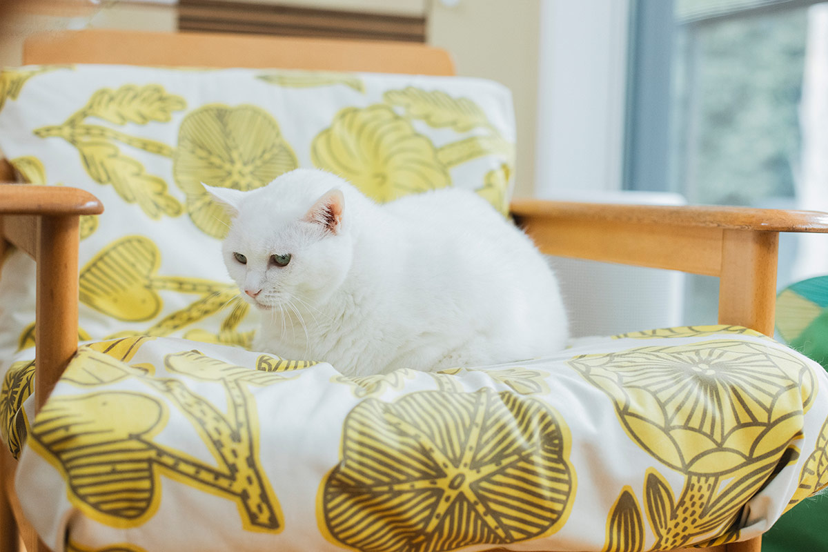 ▲愛猫マロンがくつろぐカリモクのチェアは、なんと夫が子どもの頃から使っているもの!
