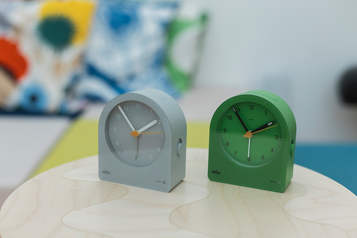 ▲最近購入したドイツの「BRAUN」の置き時計は、秒針や裏側のパーツの色使いにもこだわりを感じる名品。時計を置いているスツールはマリメッコの「ロッキ」というテキスタイルが木の柄に。上手に色を取り入れるポイントは?