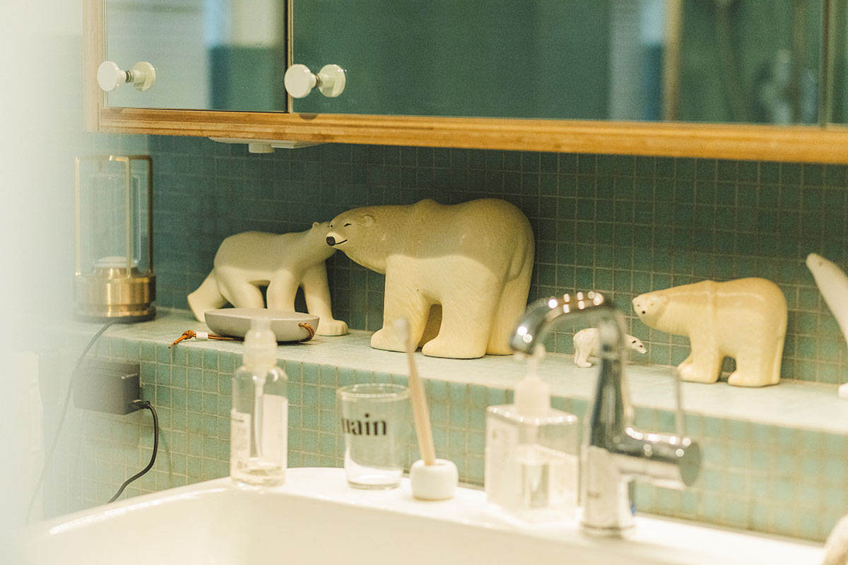 「あとは、テーマを決めるのもいいと思います。我が家のバスルームのテーマは『北極』。水色のタイルを貼り、白くまのオブジェを飾っています。