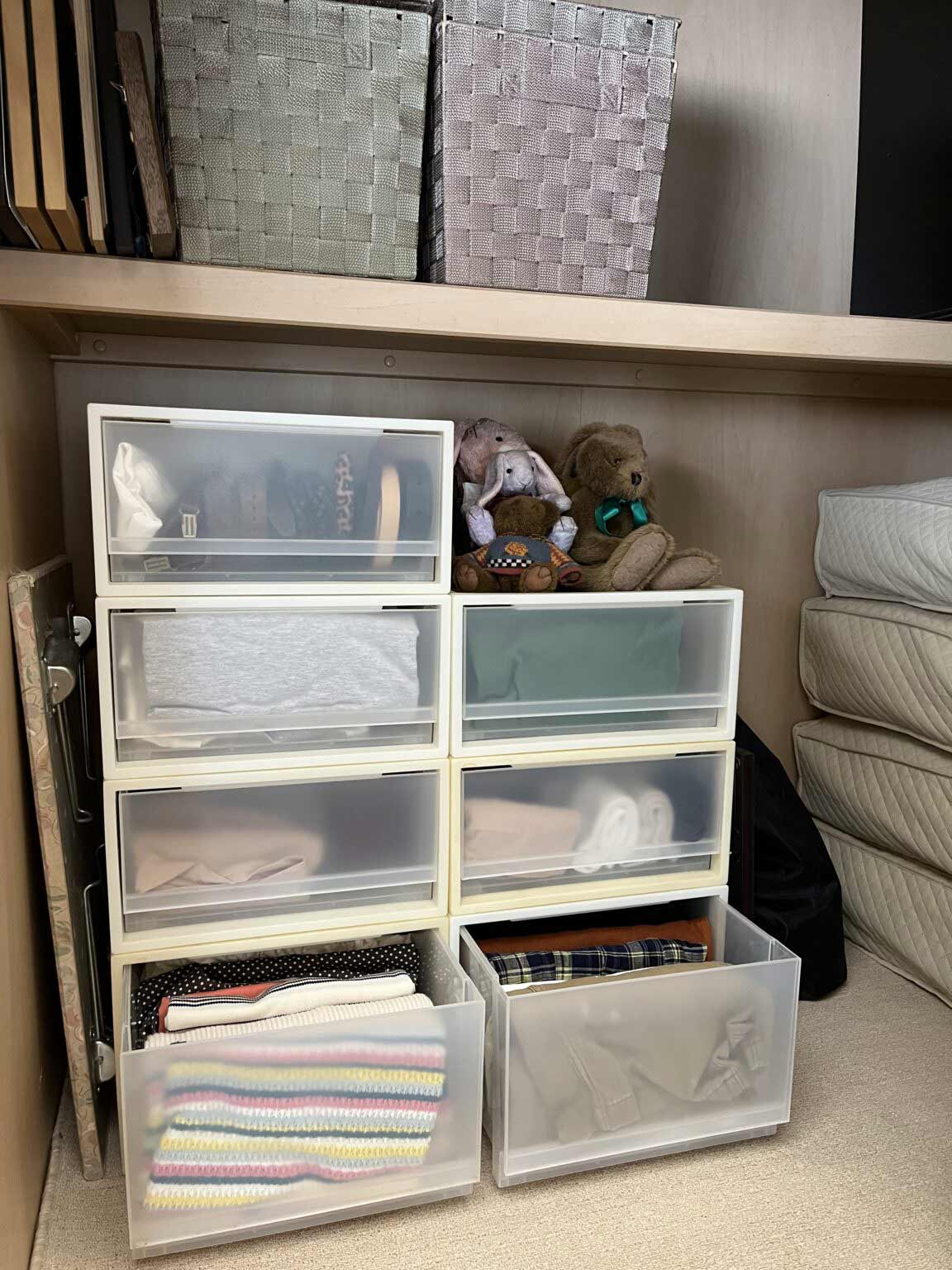 「以前は、収納ケースの中身を季節によって分けていましたが、今はアイテム別に分けています。そうすることで、何を何枚持っているかを把握しやすくなりました。
