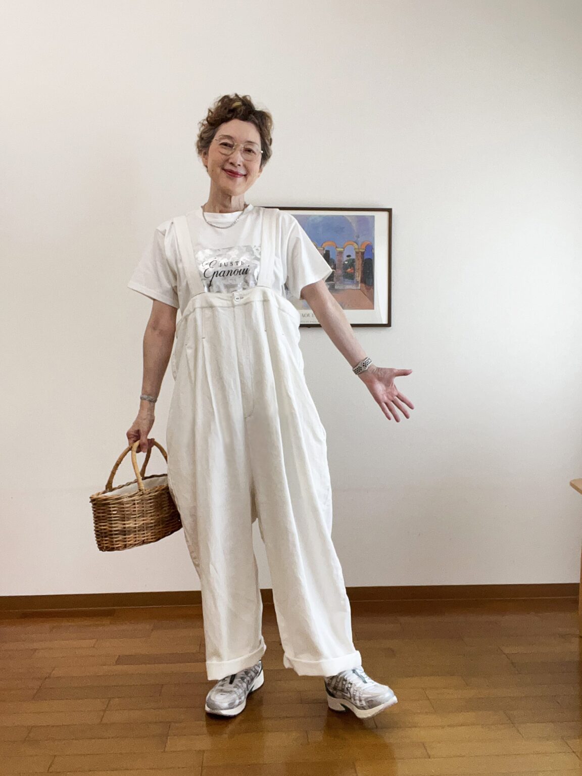 今日は、Lintu Laulu(ナチュランオリジナルブランド)の白いサロペットに、しまむらのシルバープリントのTシャツを合わせて、NIKEのスニーカーもシルバーをセレクトしました。