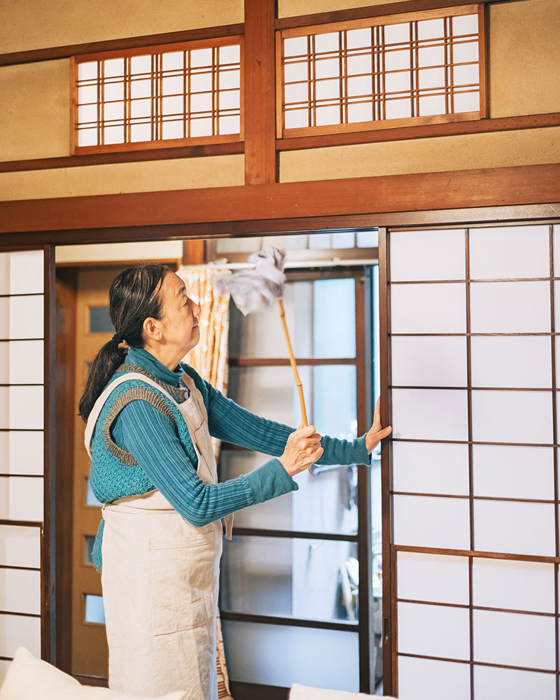 日々のお掃除には、はたきやほうきといった昔ながらの道具が大活躍。廊下のつきあたり、いつでもさっと手にとれる場所に、使い込まれた道具たちがスタンバイしています。