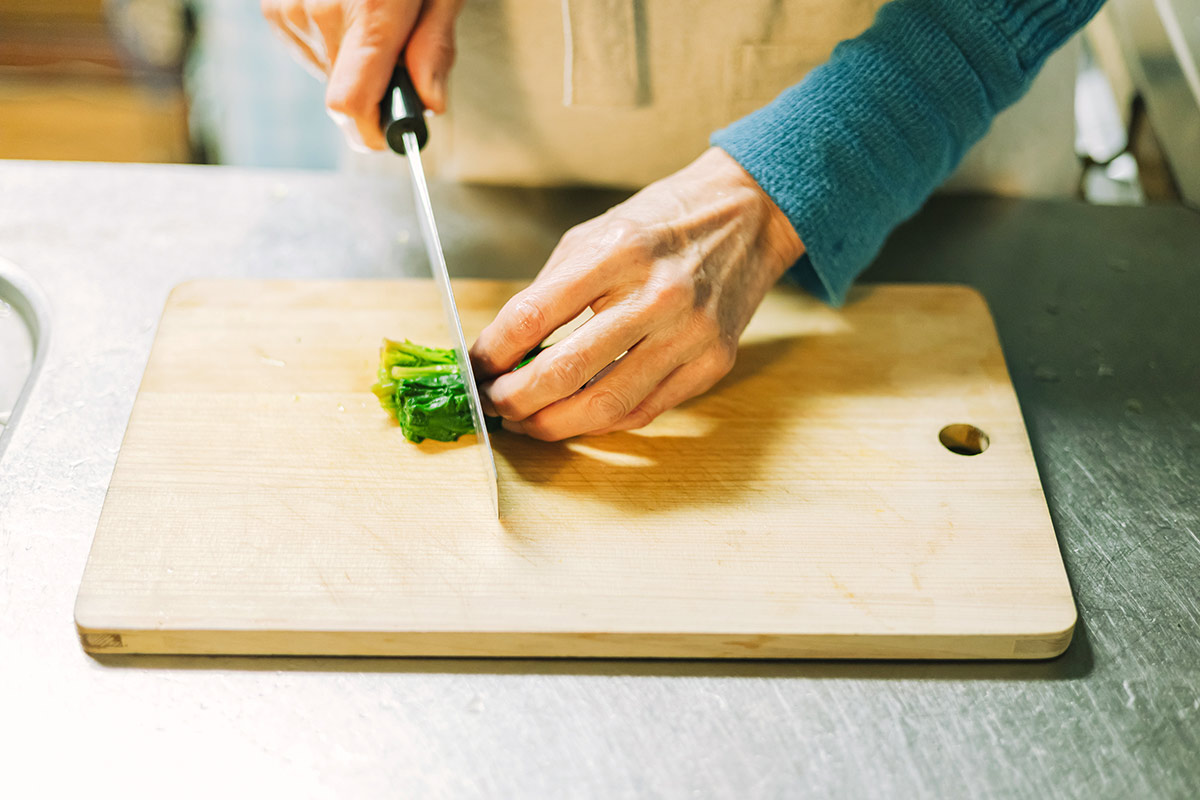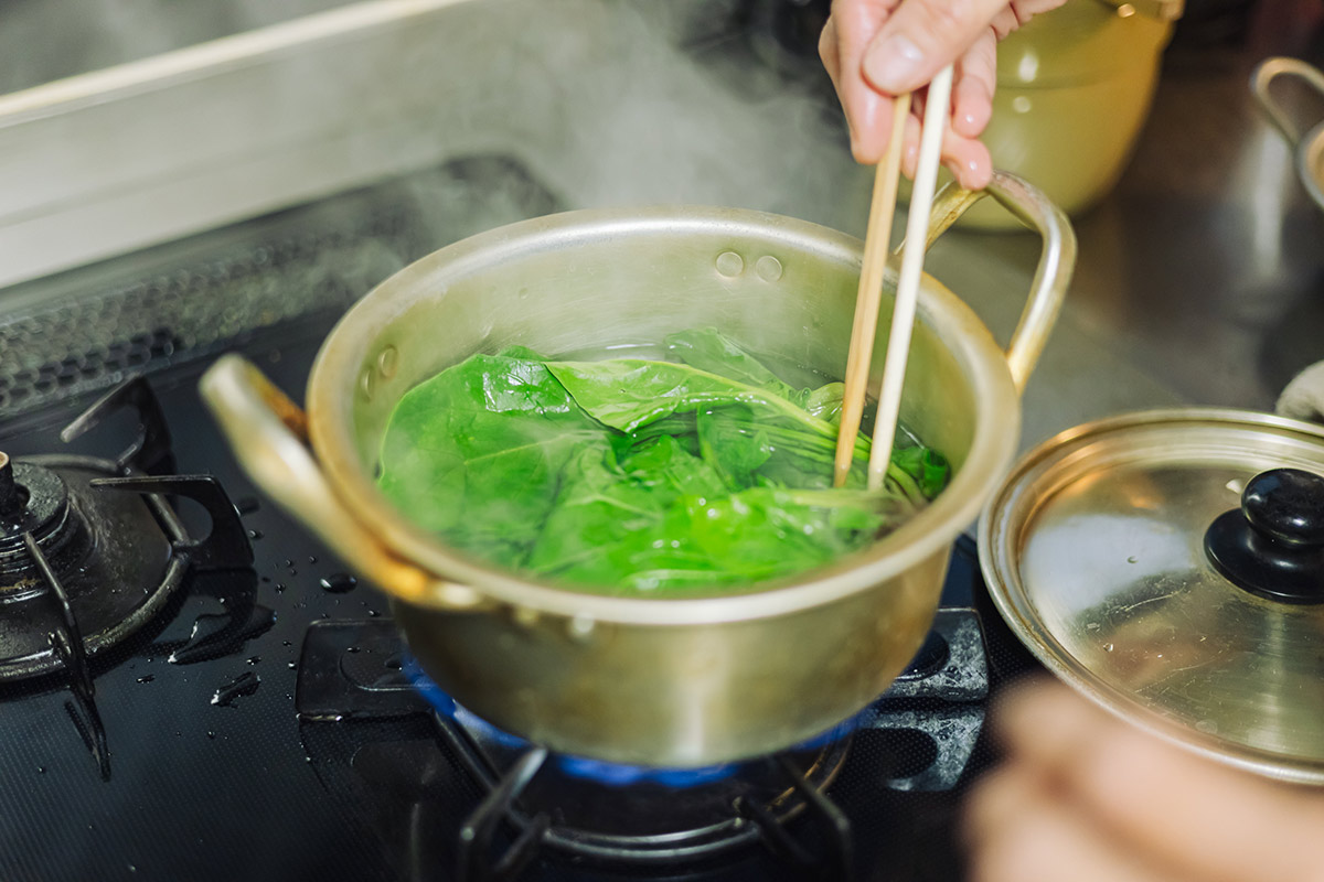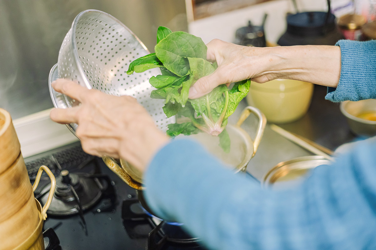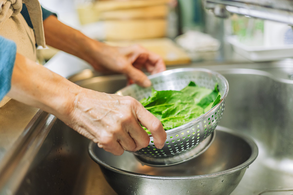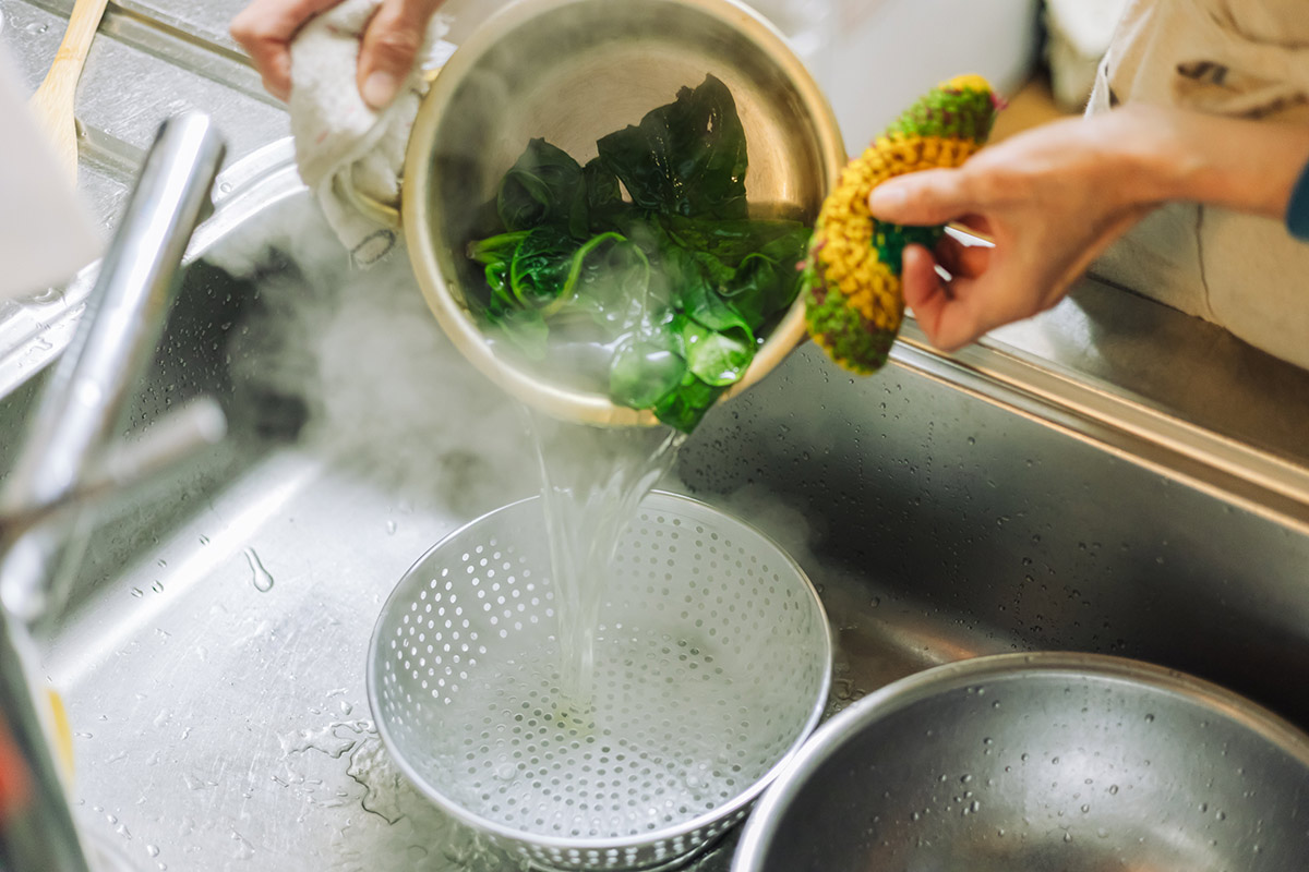 ▲アルマイトざる 22㎝ ¥2,860野菜をざぶざぶ洗うのは、丈夫で軽いアルミ製のざる。今日の副菜はほうれん草のおひたしです。