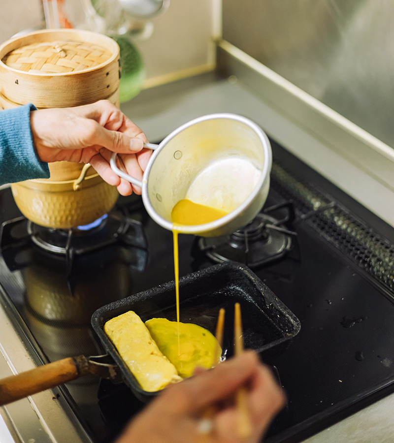 ジュワッとフライパンに流し込む、いい音が聞こえてきました。卵液入れに使っているのは、マッコリカップ。もともとは韓国のお酒・マッコリを飲むための道具ですが、調理道具としても優れものです。