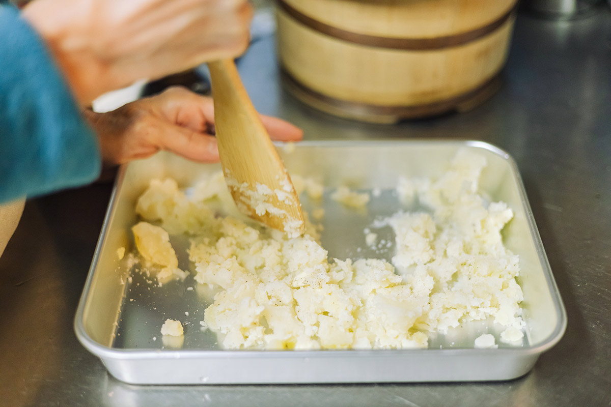▲アルマイトバット中 ¥1,760、スス竹ターナー ¥1,210あつあつのジャガイモはバットの上でつぶしていきます。味付けは、塩コショウとバター。「広げると冷めるのが早いでしょ」と、お弁当づくりがはかどるコツをきぬ子さんが教えてくれました。