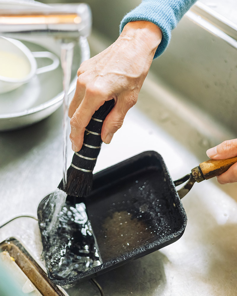 ▲シュロ棒たわし ¥3,960こまめに洗えばシンクもきれい。鉄の卵焼き器は、熱いうちに汚れを落とします。持ち手付きのたわしなら、やけどの心配がなく安全。