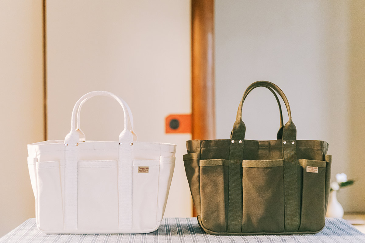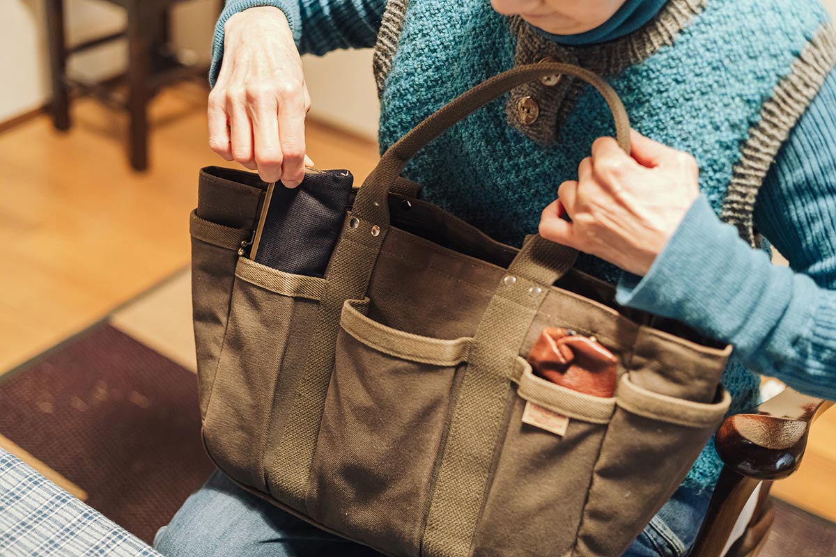 バッグのデザイナーは弘さん。ポケットの多いアメリカのガーデニングバッグをもとに改良を重ねて、この形に辿りつきました。年齢や性別問わずファンの多い、松野屋のロングセラーです。