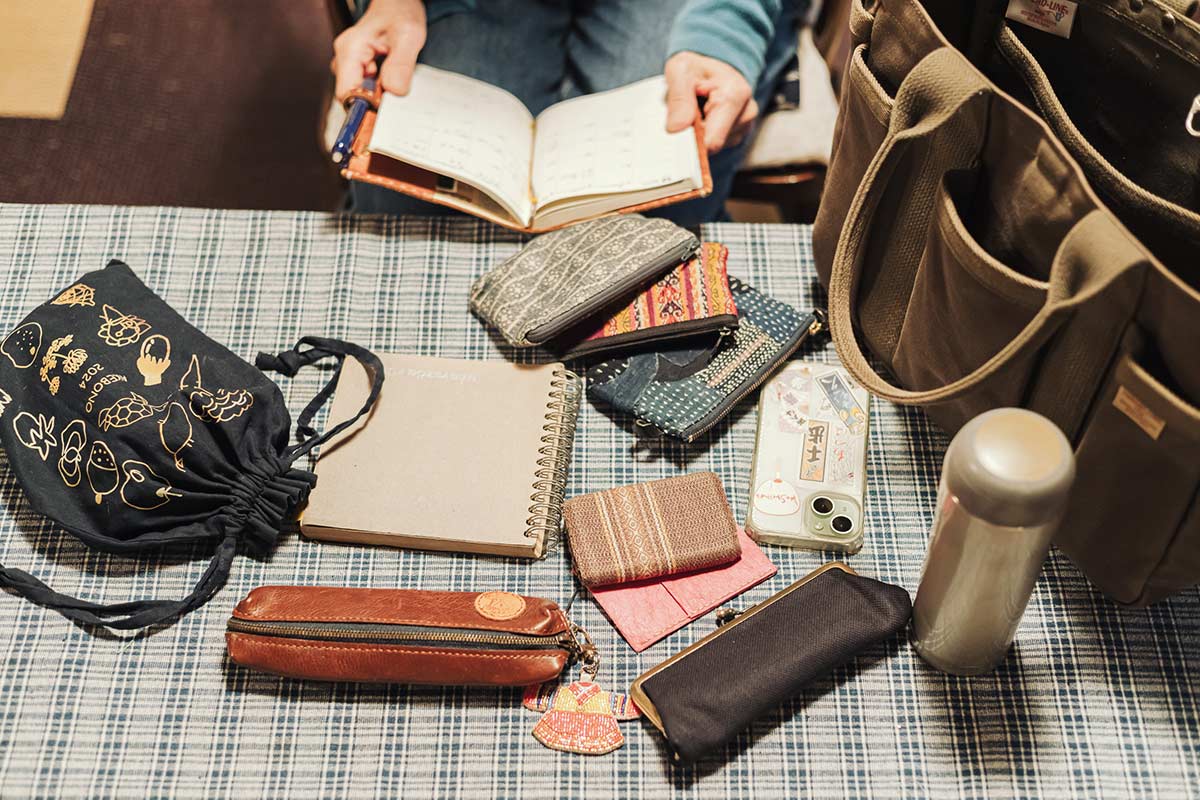 ▲手帳にポーチ、水筒、ペンケース。ポケットにスイスイ迷いなく入れていきます。