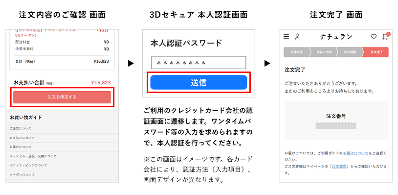 - 3Dセキュアのパスワードやご登録方法等については、発行元クレジットカード会社へ直接お問い合わせをお願いします。
